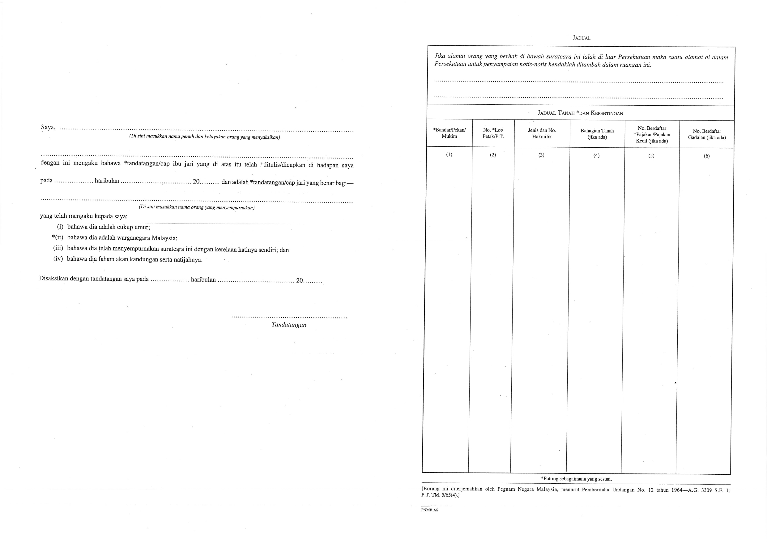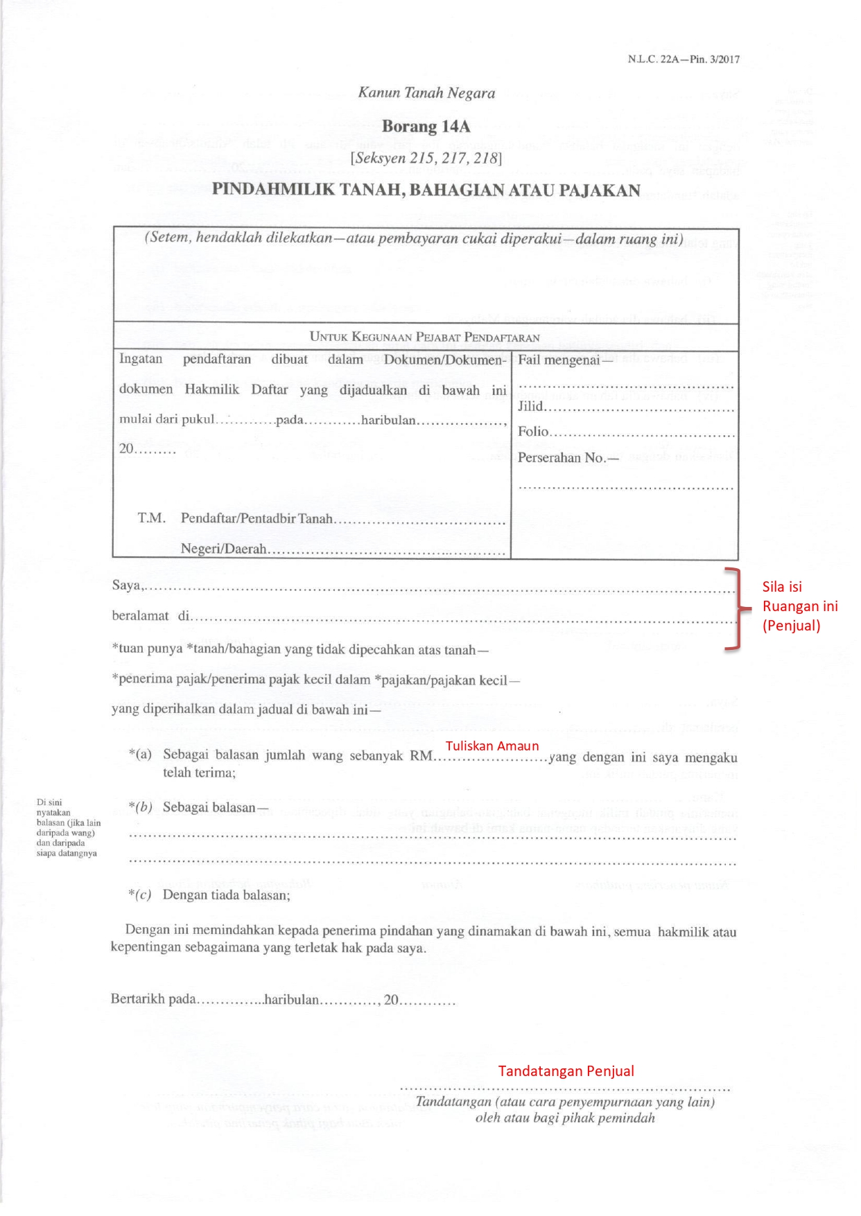 1. Pindah Milik Tanah/Pajakan (Borang 14A)/ Gadaian (Borang 16A) :-